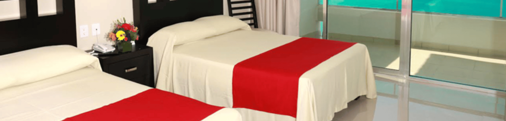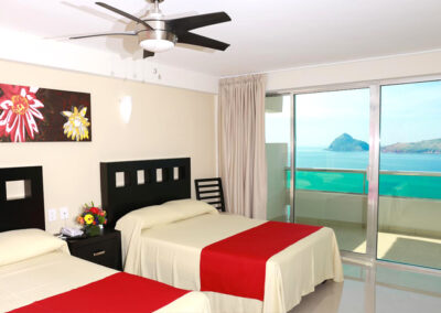 Cuenta con dos camas matrimoniales, aire acondicionado, baño, televisión por cable, plancha, secadora para cabello, reloj alarma, teléfono, algunas habitaciones con vista al mar y otras con vista a la ciudad.