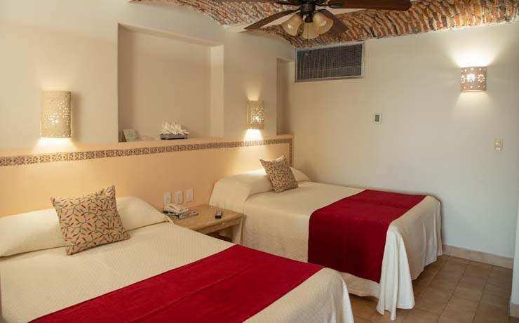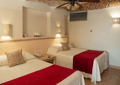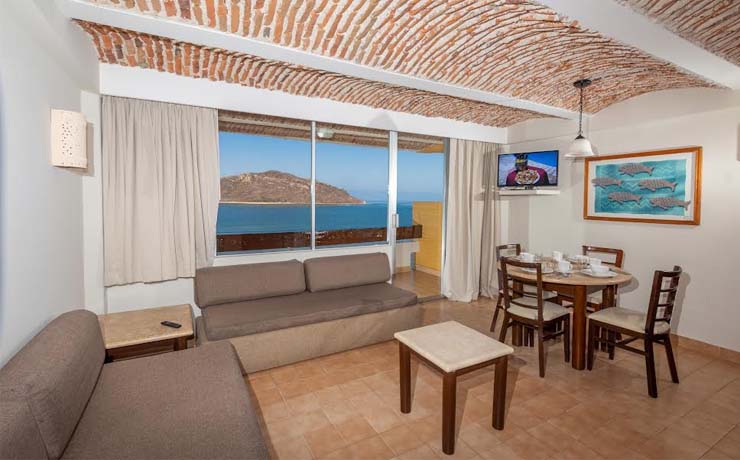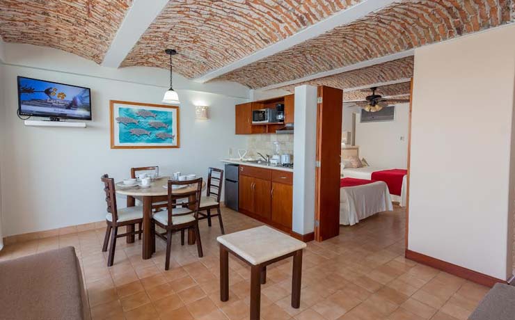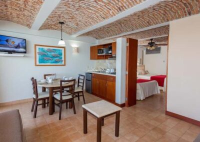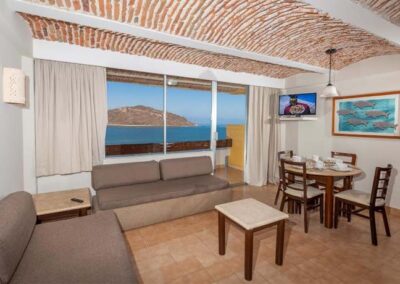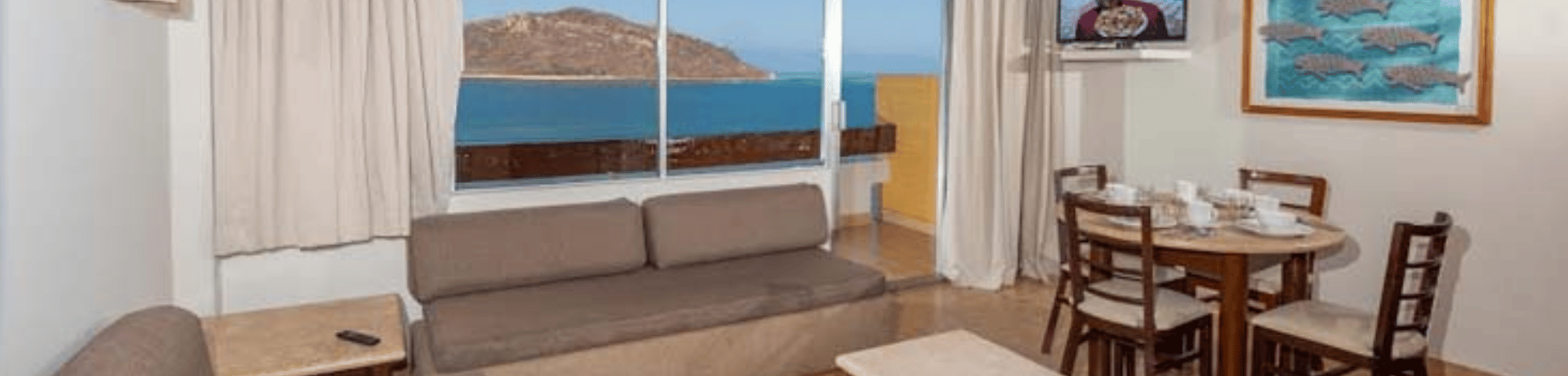 Habitación suite, cuenta con una recámara con dos camas matrimoniales, sala con dos sofás que se pueden utilizar como cama individual, aire acondicionado, baño, televisión por cable, teléfono, plancha, secadora para cabello, reloj alarma, cocineta totalmente equipada, licuadora, microondas, cafetera, tostador, parrilla con dos quemadores, refrigerador y balcón con vista al mar.